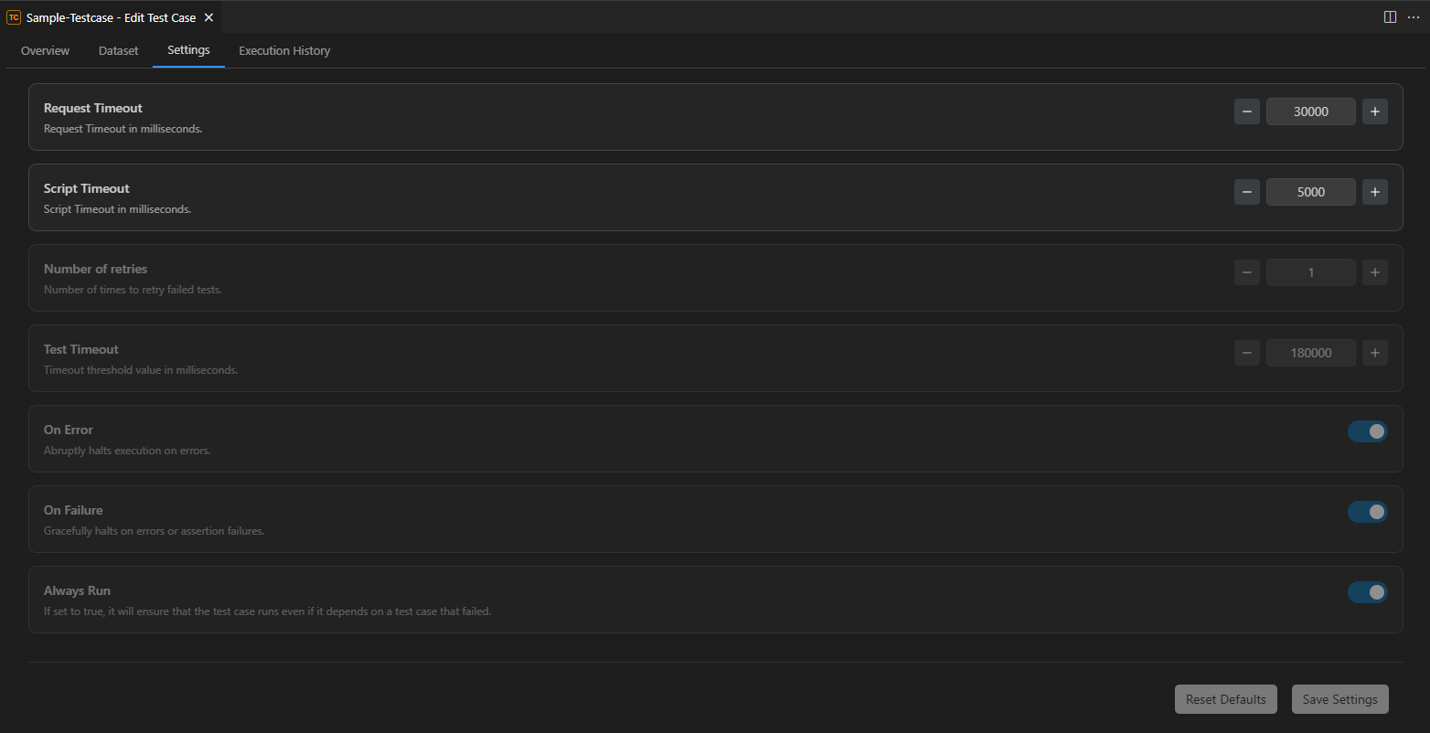 The Settings section allows you to configure test case-specific settings and preferences, including: