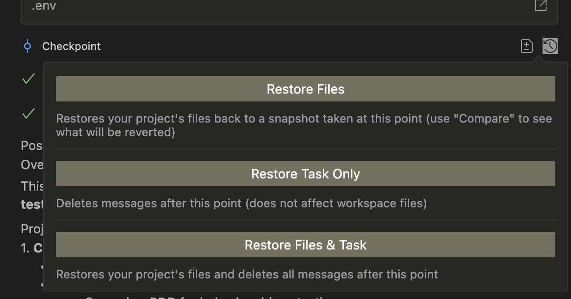 - Use "Restore Task Only" to try different prompts, but keep file changes