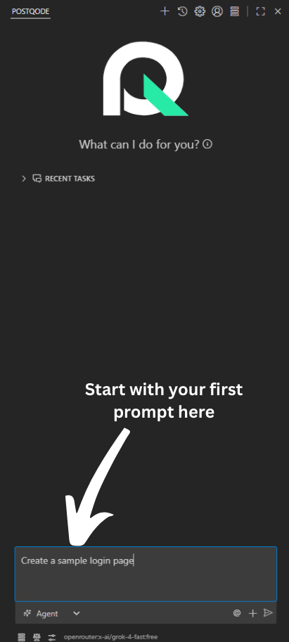 Type a clear, concise description of what you want PostQode to do in the chat box at the bottom of the panel. Examples of effective tasks: