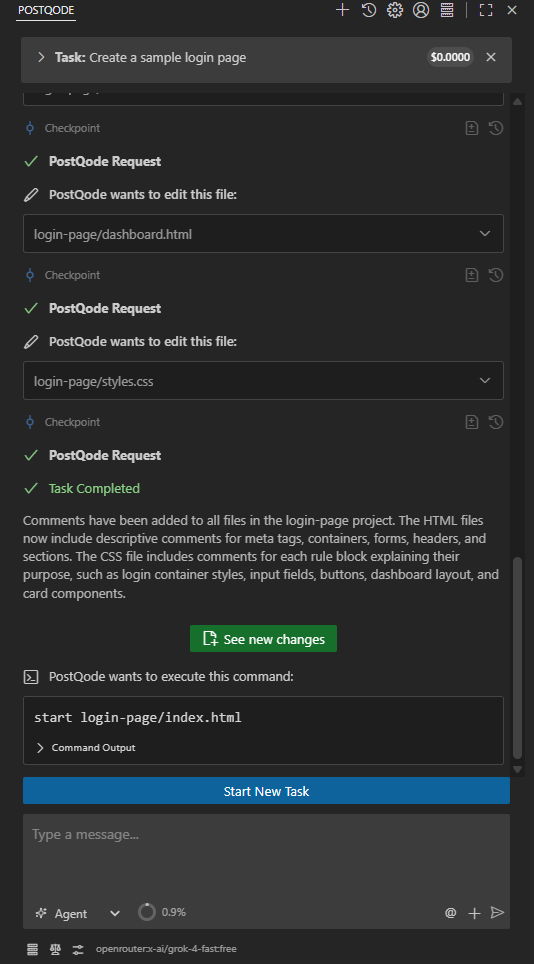 After completing the task, PostQode shows the final result and awaits your next instruction.