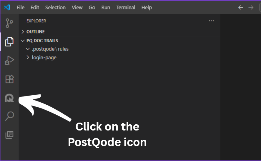 Click the PostQode icon () in the VS Code Primary Side Bar (vertical bar on the side of the window) to open the chat interface. If you don't see the icon, verify the extension is installed and enabled.